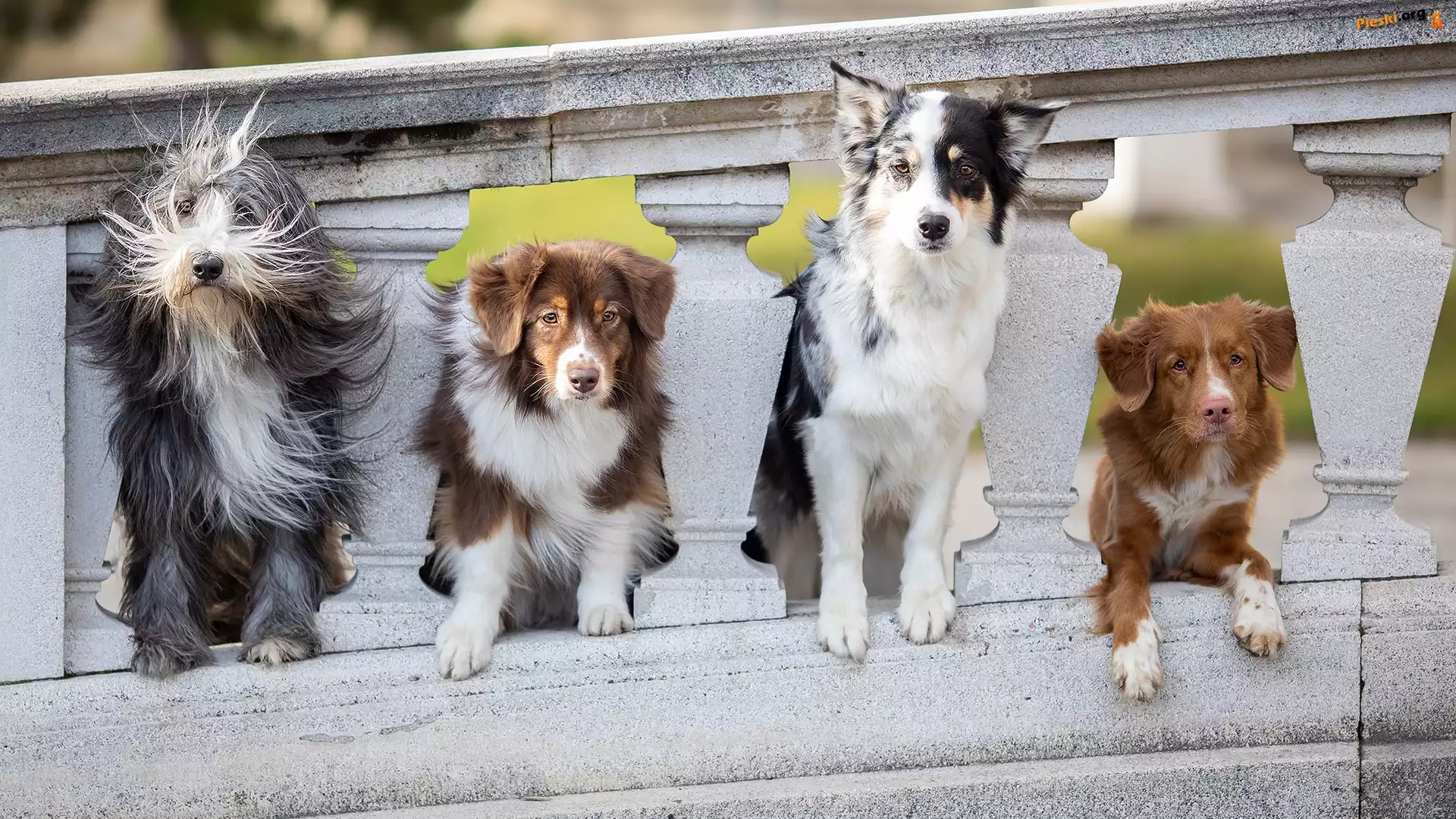 Border collie, Cztery, Retriever z Nowej Szkocji, Kamienna, Owczarek staroangielski Bobtail, Psy, Owczarek australijski, Balustrada, Pieski