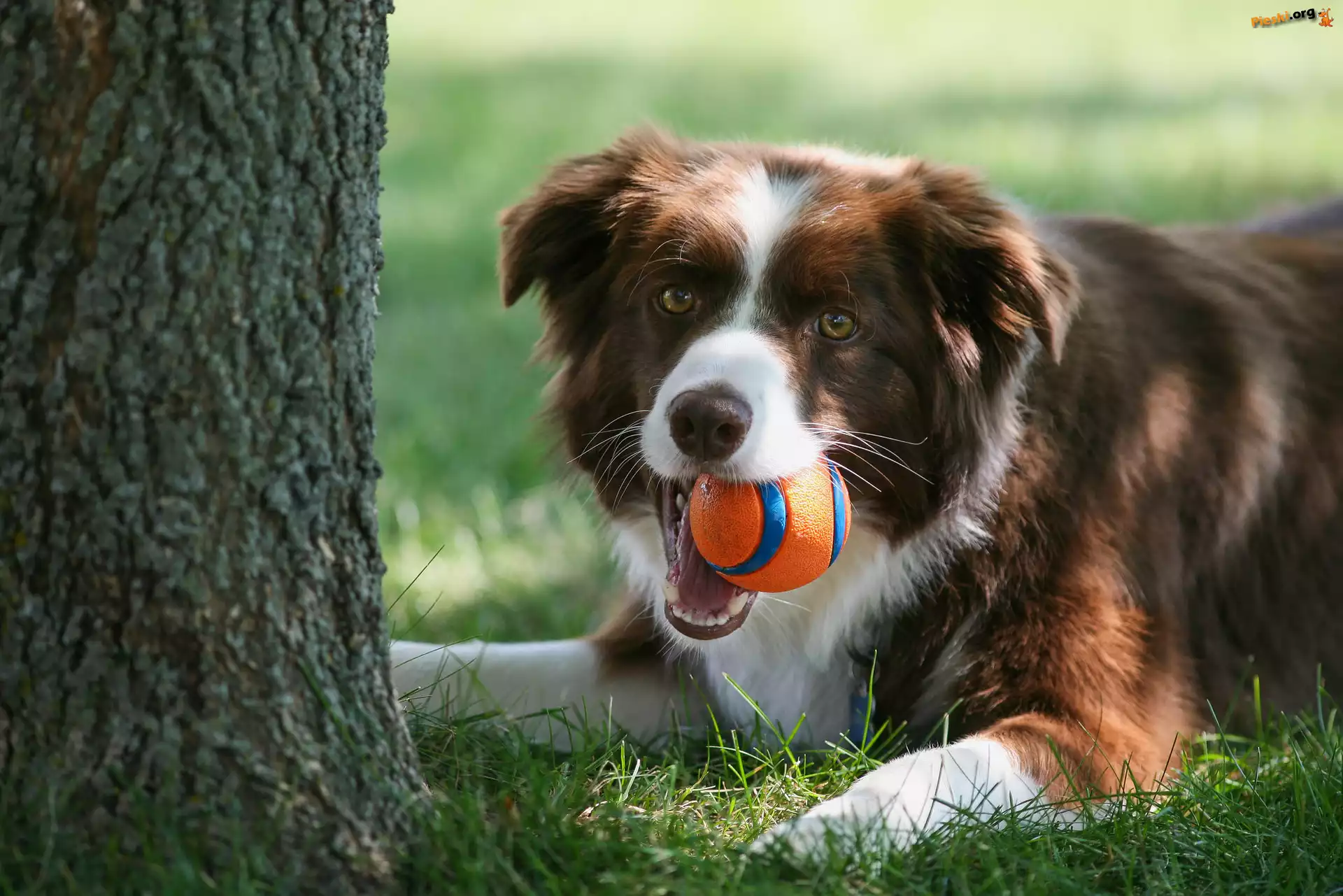 Border collie, Drzewo, Trawa, Piłeczka