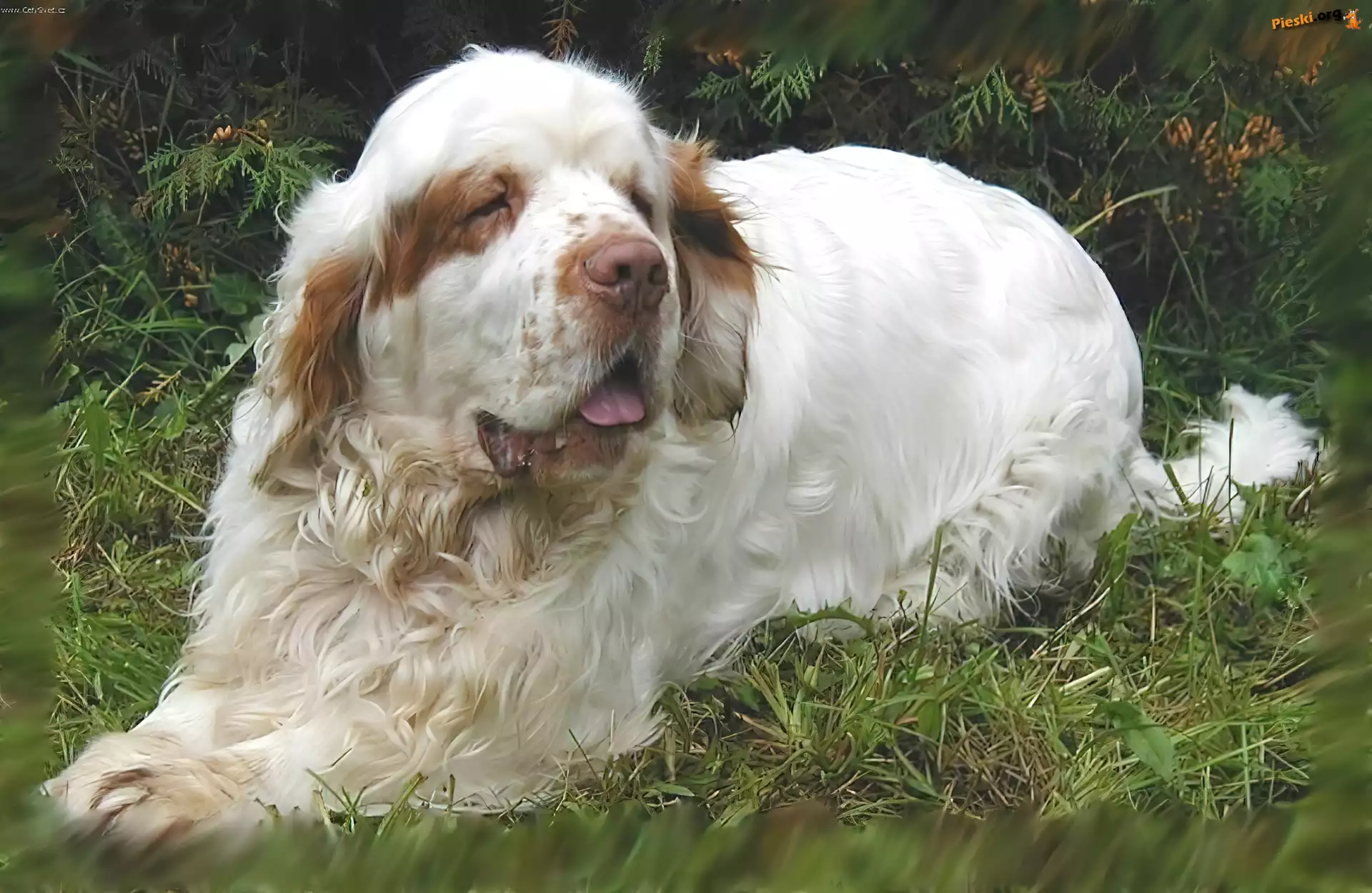dorosły, Clumber spaniel, trawa, Pieski