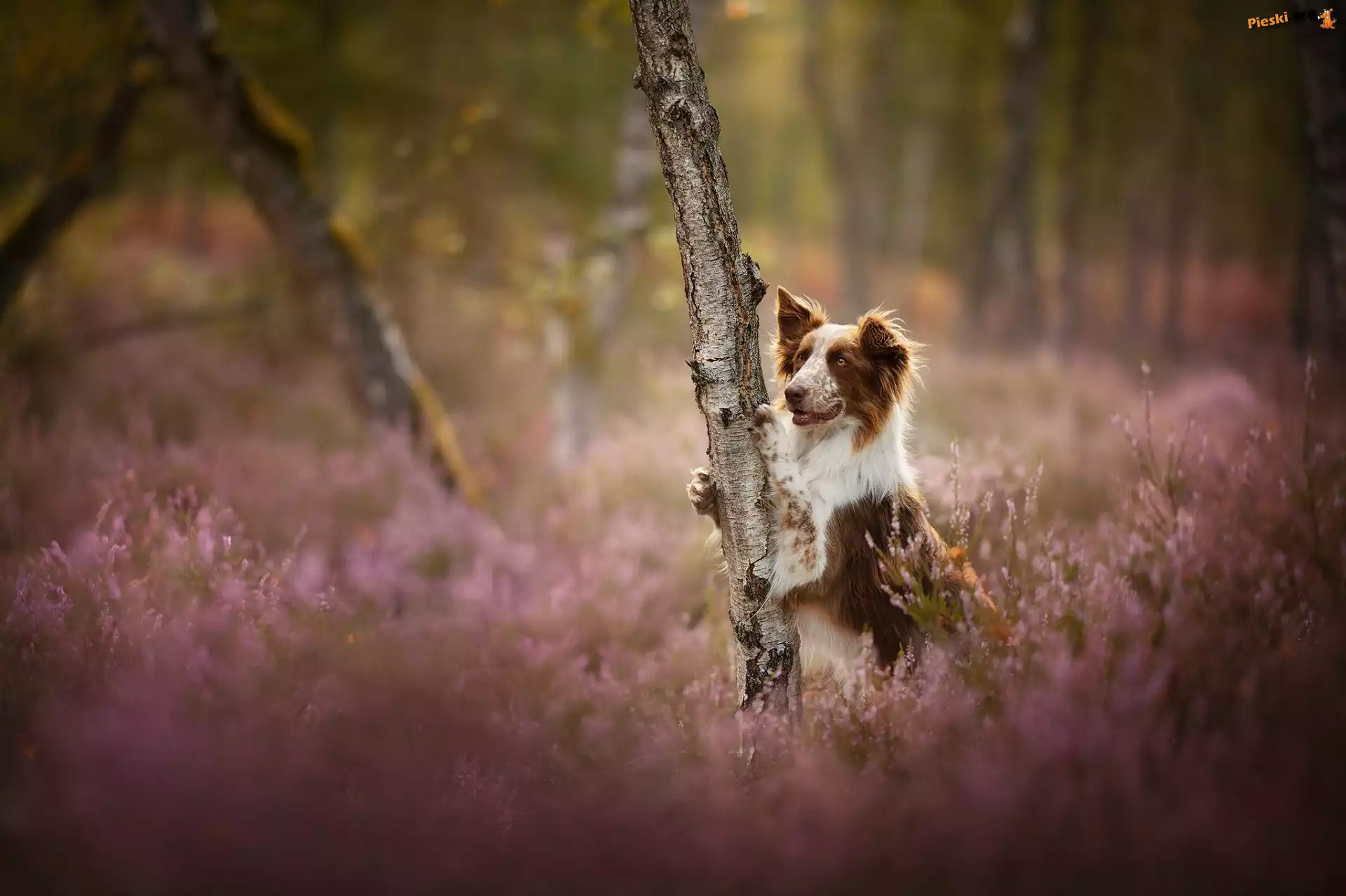 Drzewo, Pies, Border collie, Wrzosy, Pieski