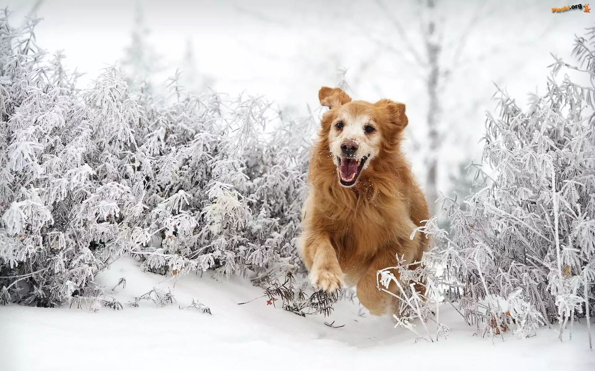 Golden Retriever, Bieg, Śnieg, Pieski