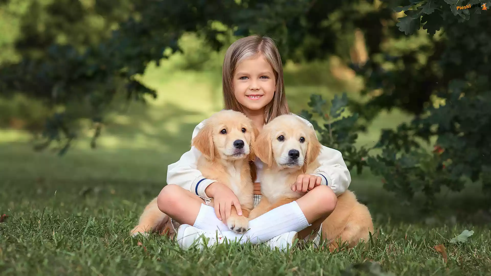 Dwa, Trawa, Dziewczynka, Golden retriever, Szczeniaki, Pieski