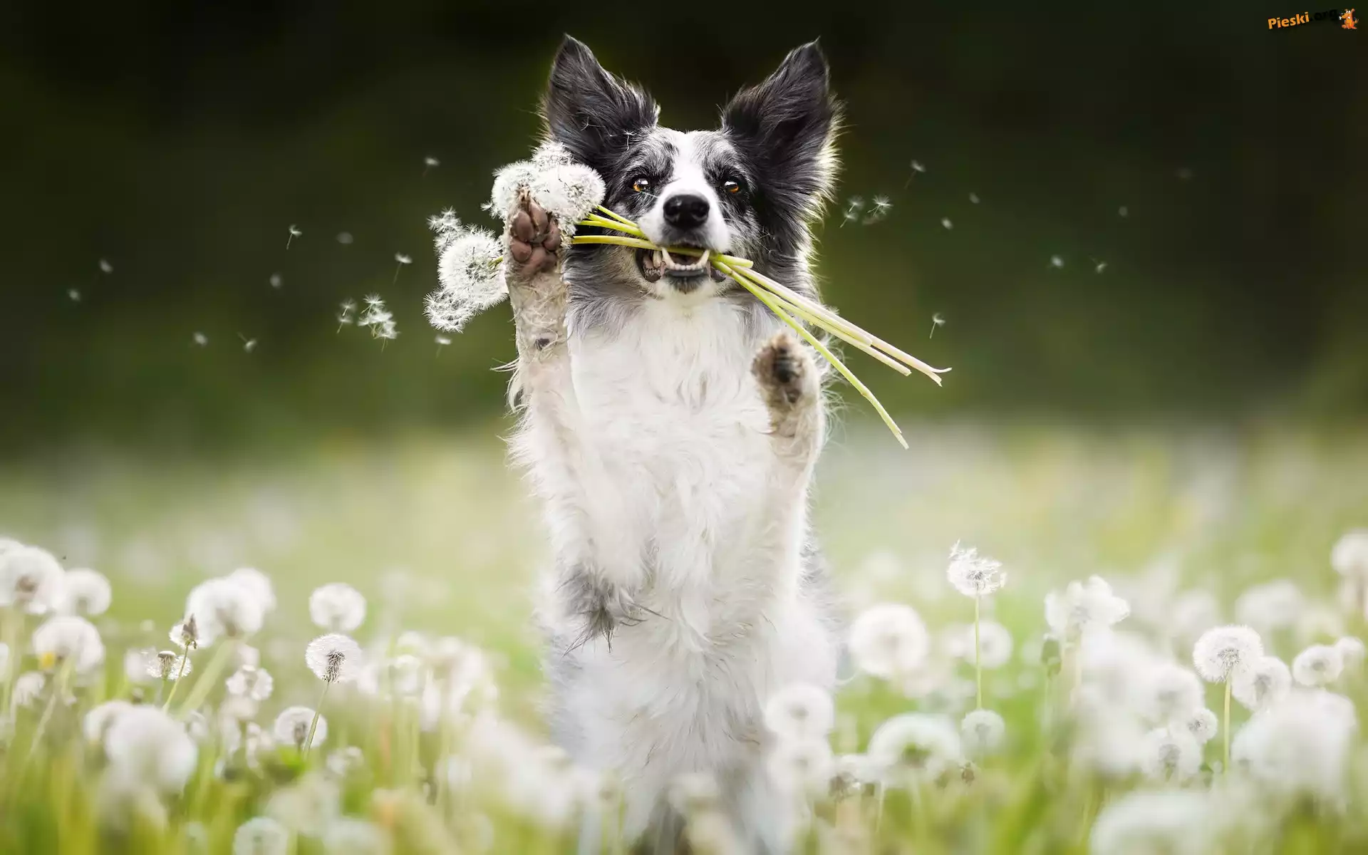 Dmuchawce, Łąka, Pies, Border collie