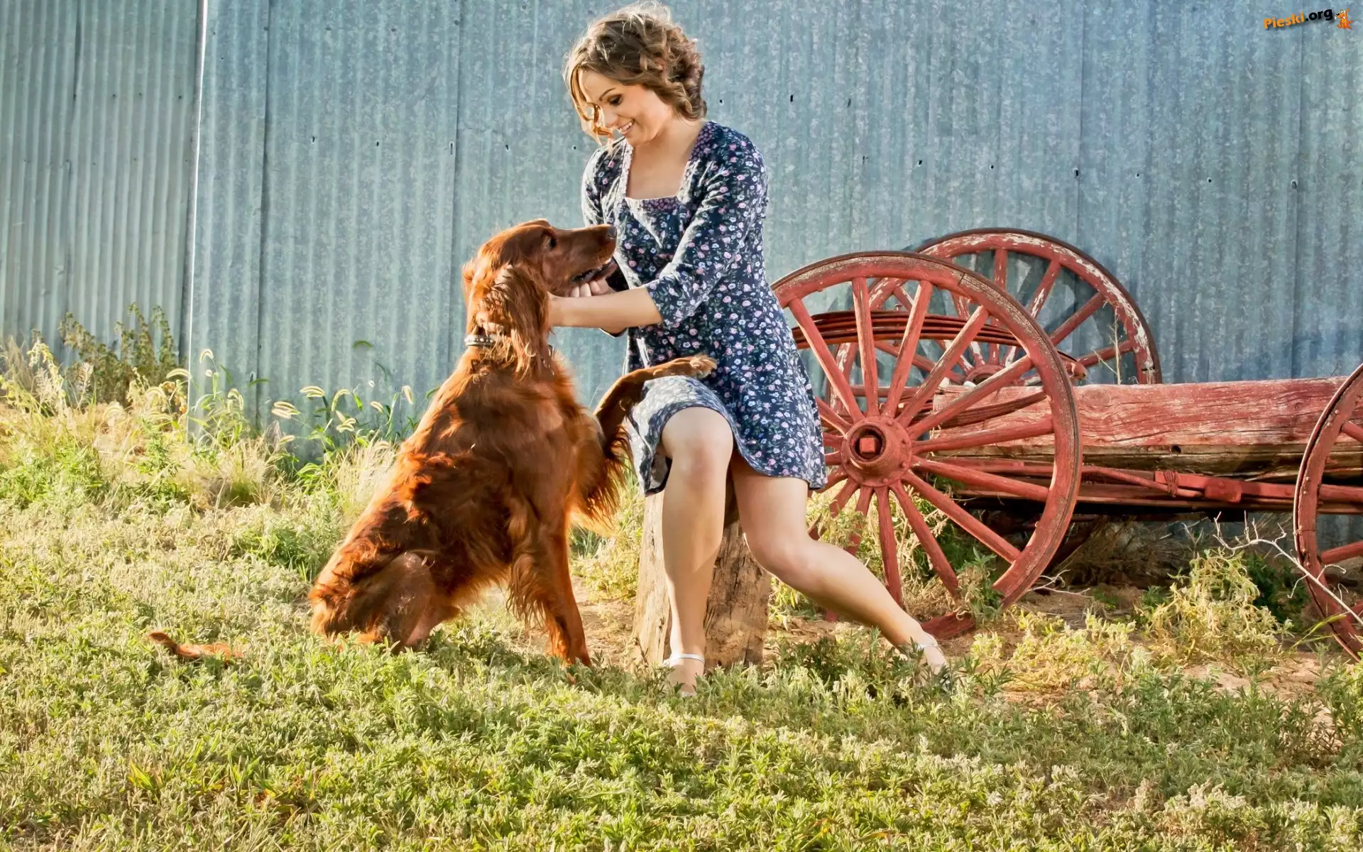 Lato, Pies, Kobieta, Wieś, Seter irlandzki, Pieski