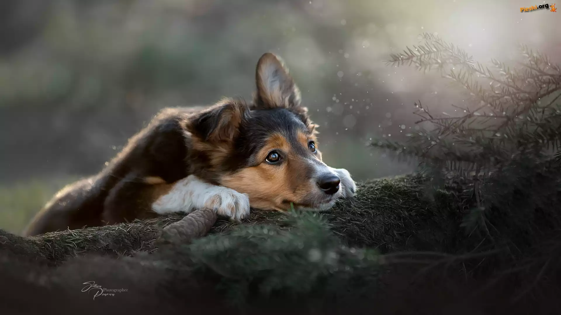 Szyszka, Leżący, Iglaste, Szczeniak, Pies, Kłoda, Gałązki