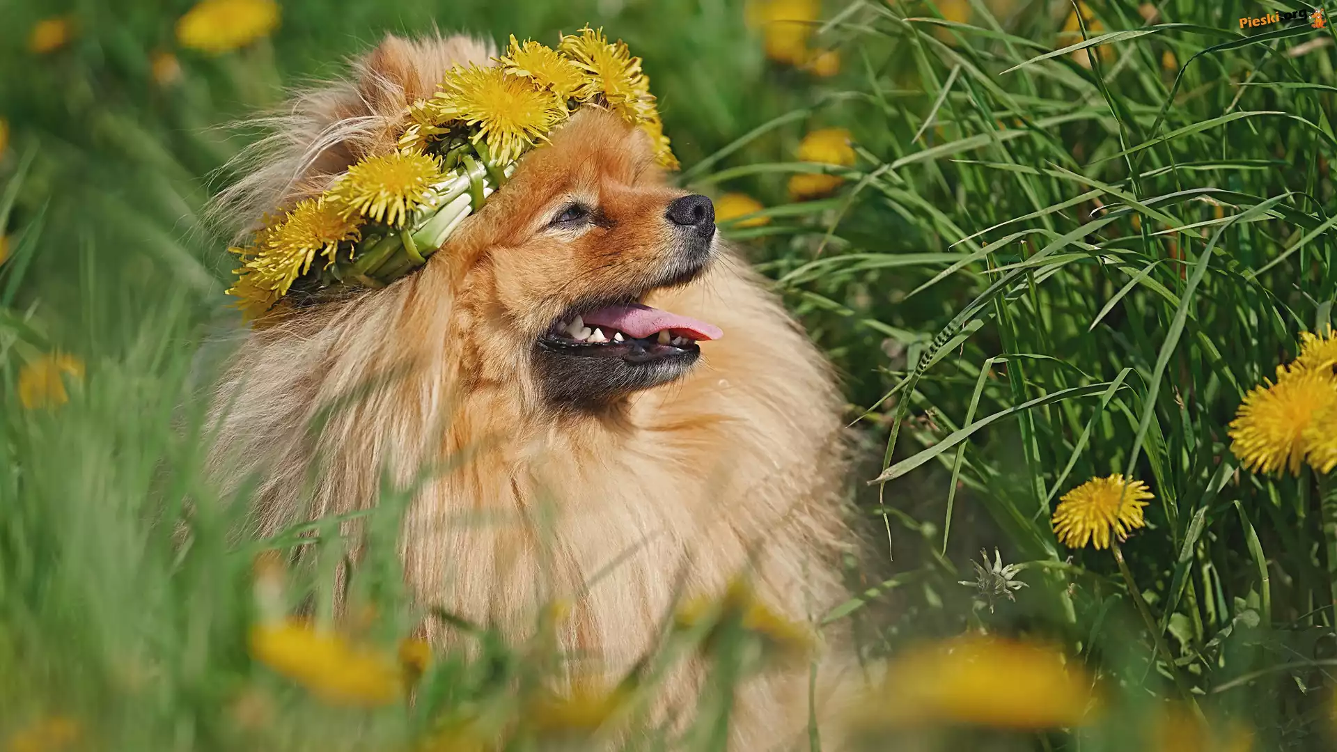 Pies, Mniszki, Kwiaty, Szpic miniaturowy, Wianek, Trawa