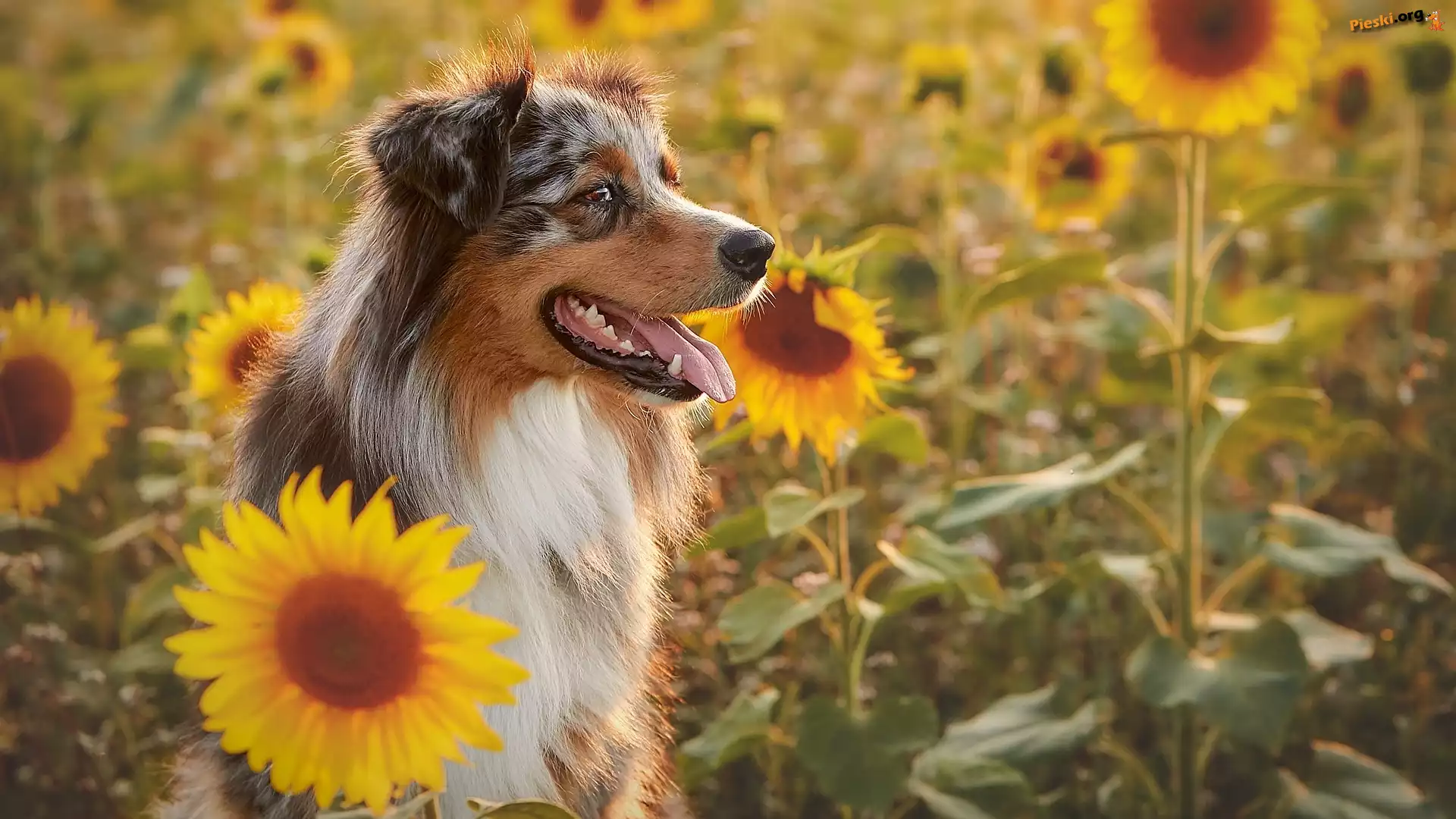 Pies, Owczarek australijski, Słoneczniki, Pieski