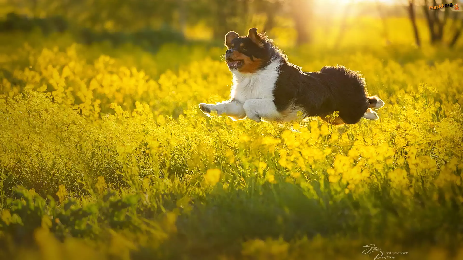 Żółte, Skaczący, Pies, Kwiaty, Pieski