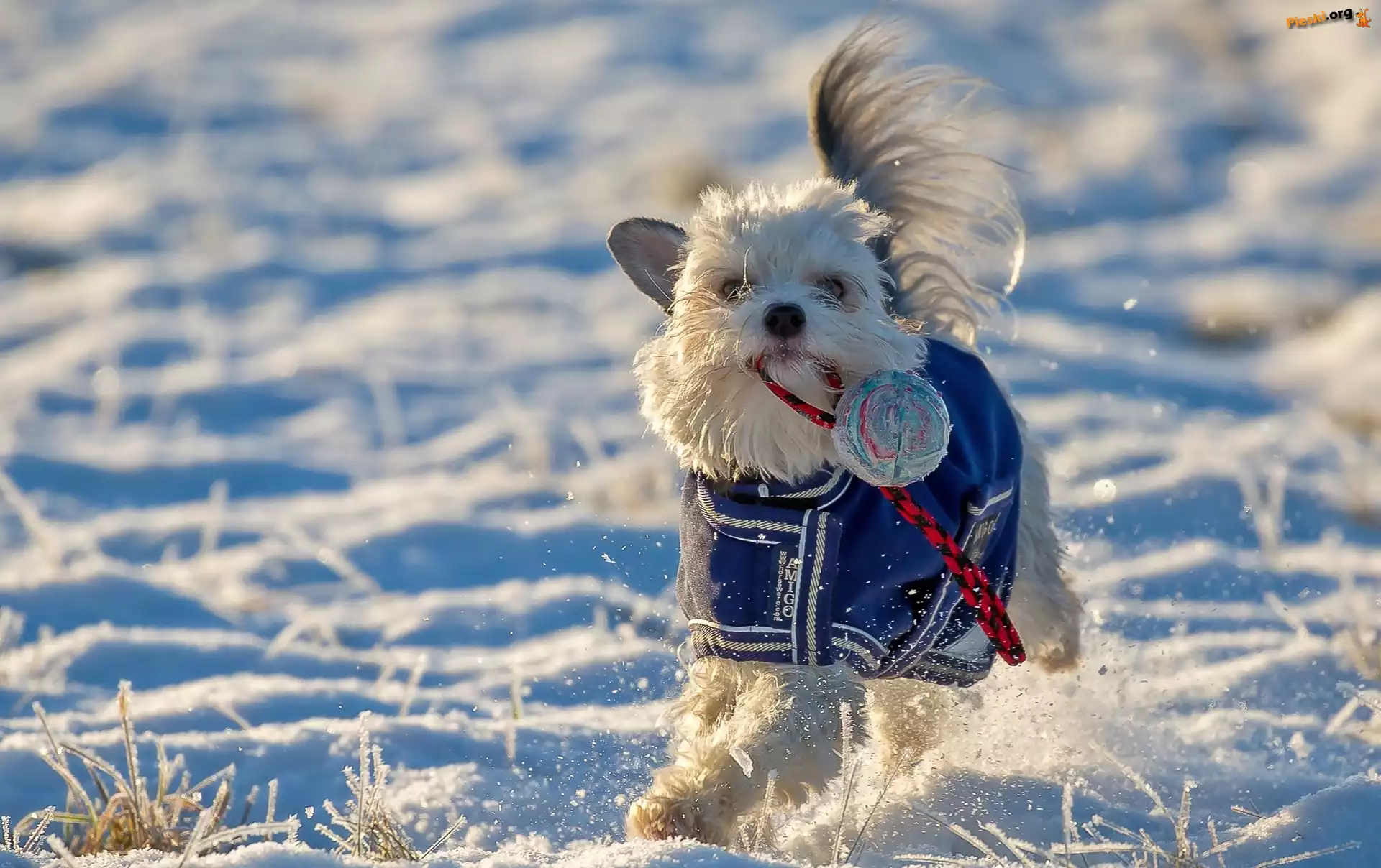 Piłka, Szczeniak, Zabawa, Śnieg, Pieski