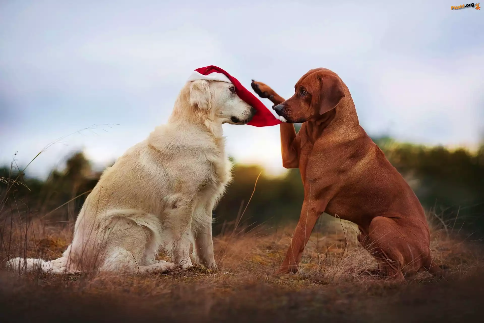 Rhodesian ridgeback, Psy, Dwa, Golden retriever, Czapka, Pieski
