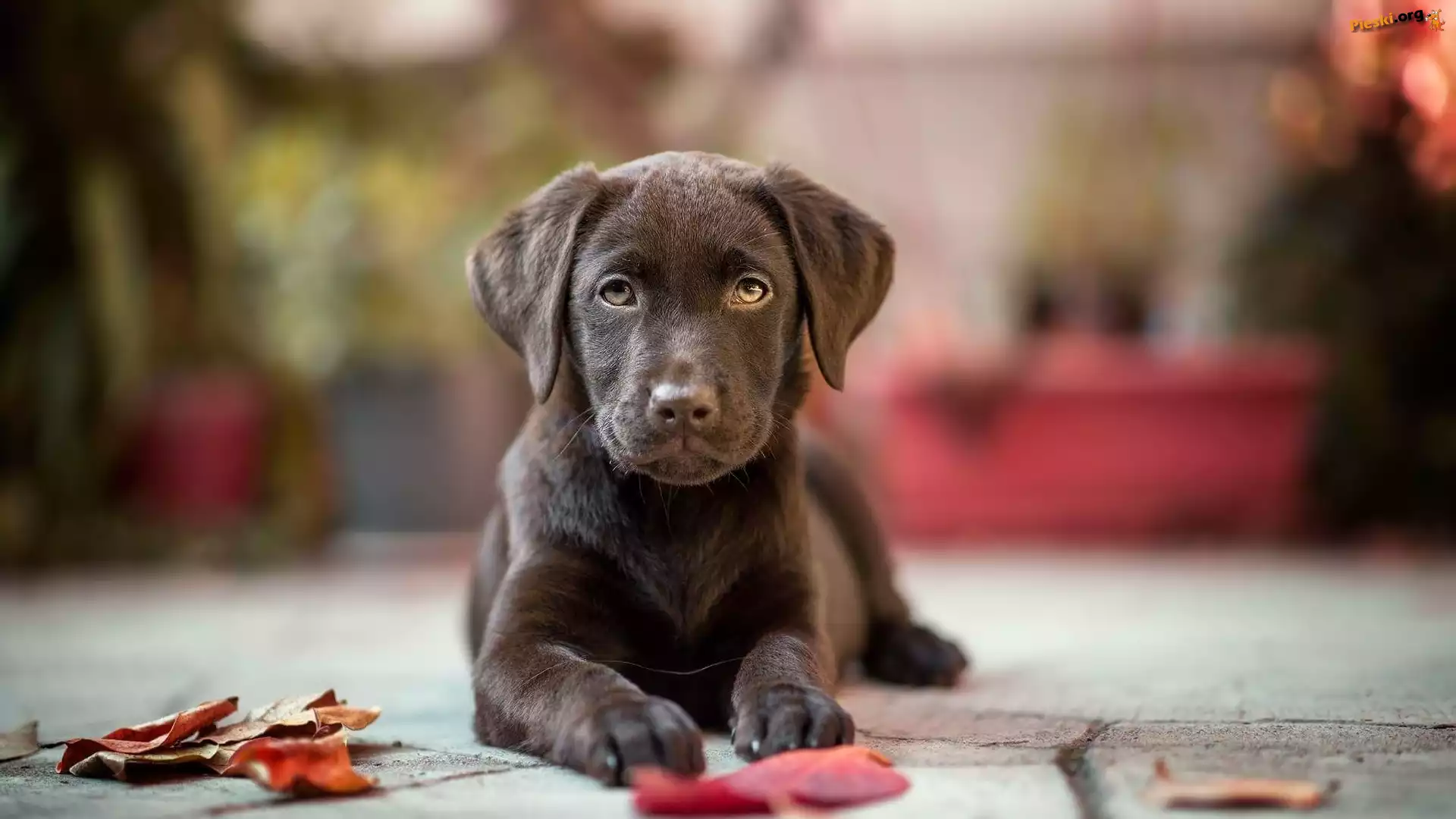 Czekoladowy, Rozmyte, Chodnik, Labrador retriever, Liście, Tło