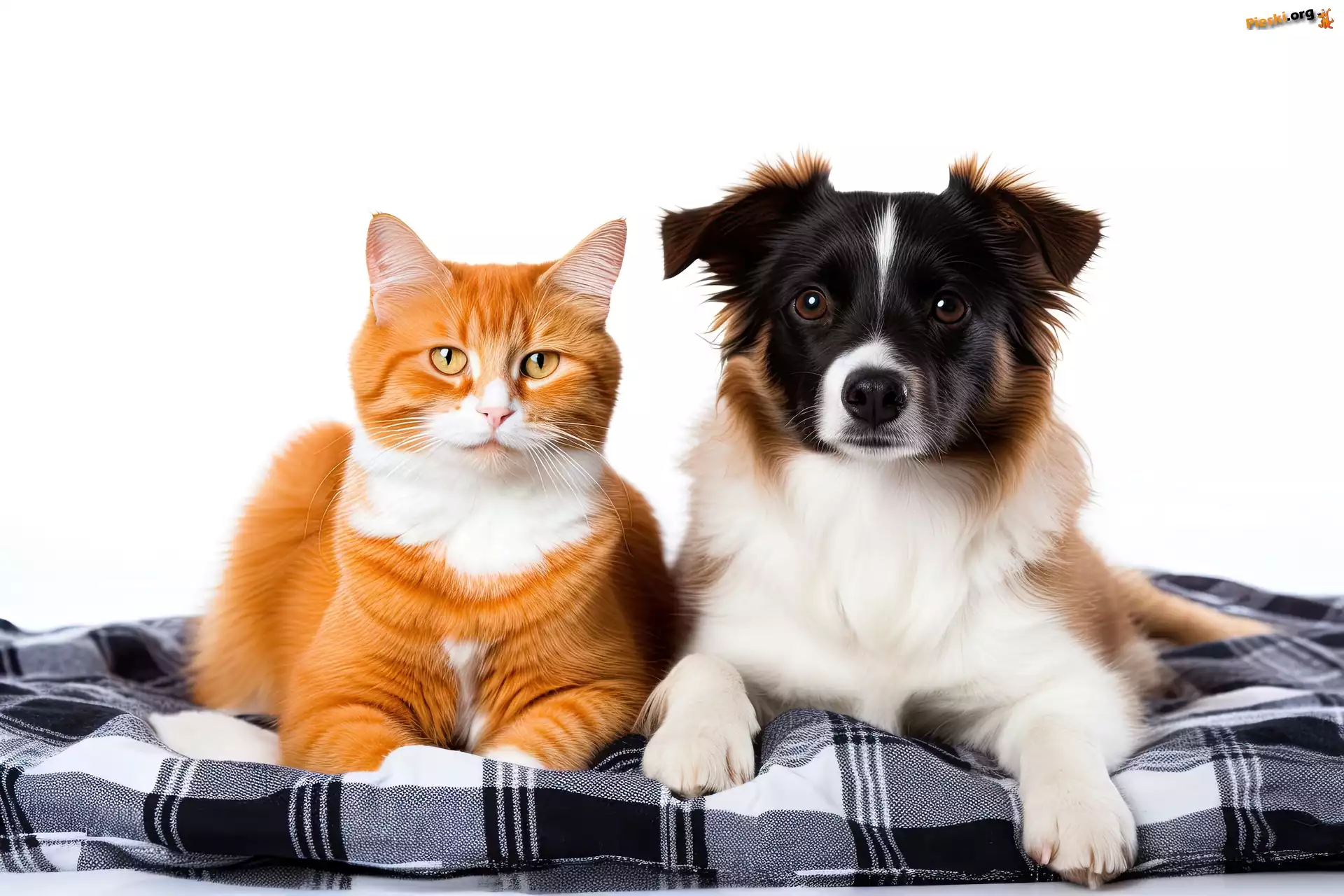 Pies, Białe tło, Rudy, Koc, Kot, Pieski