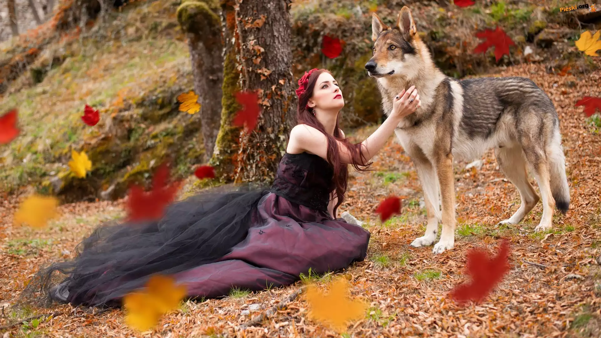 Spadające, Pies, Kobieta, Wilczak czechosłowacki, Liście, Pieski