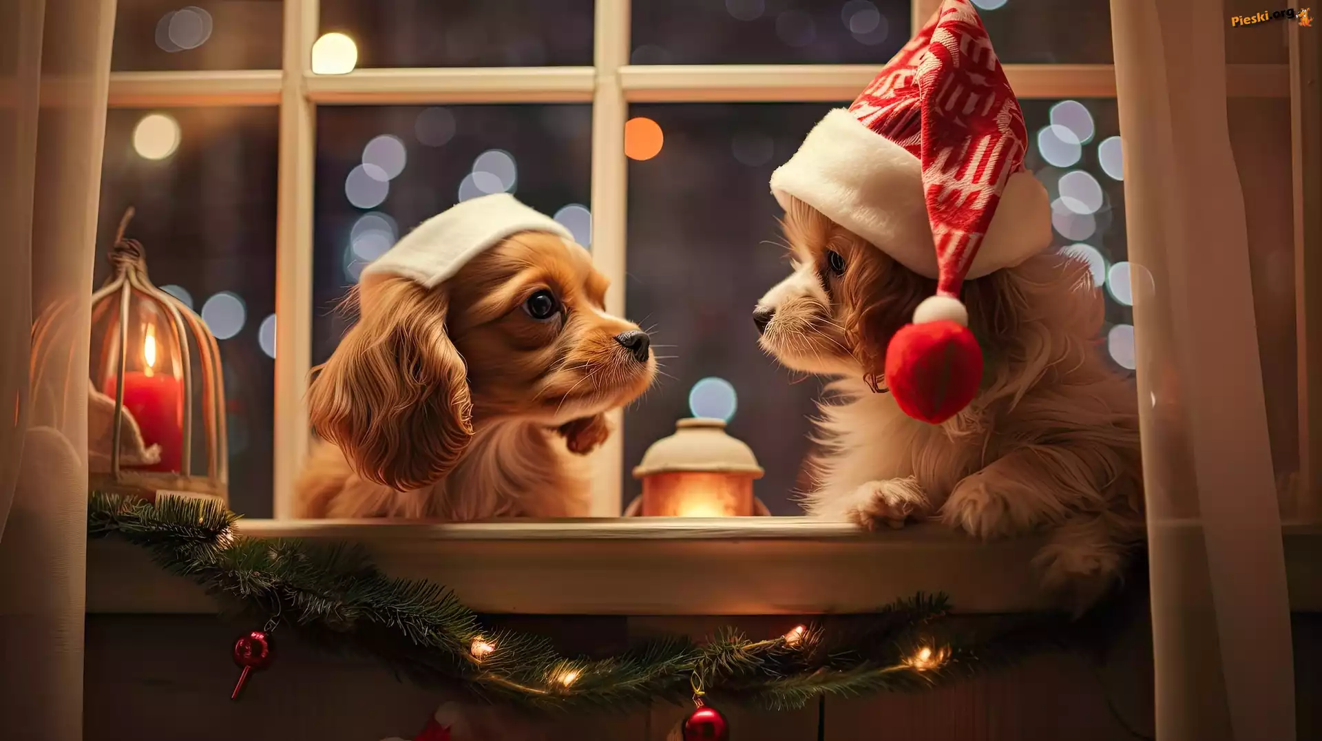 Czapki, Świeca, Psy, Okno, Szczeniaki