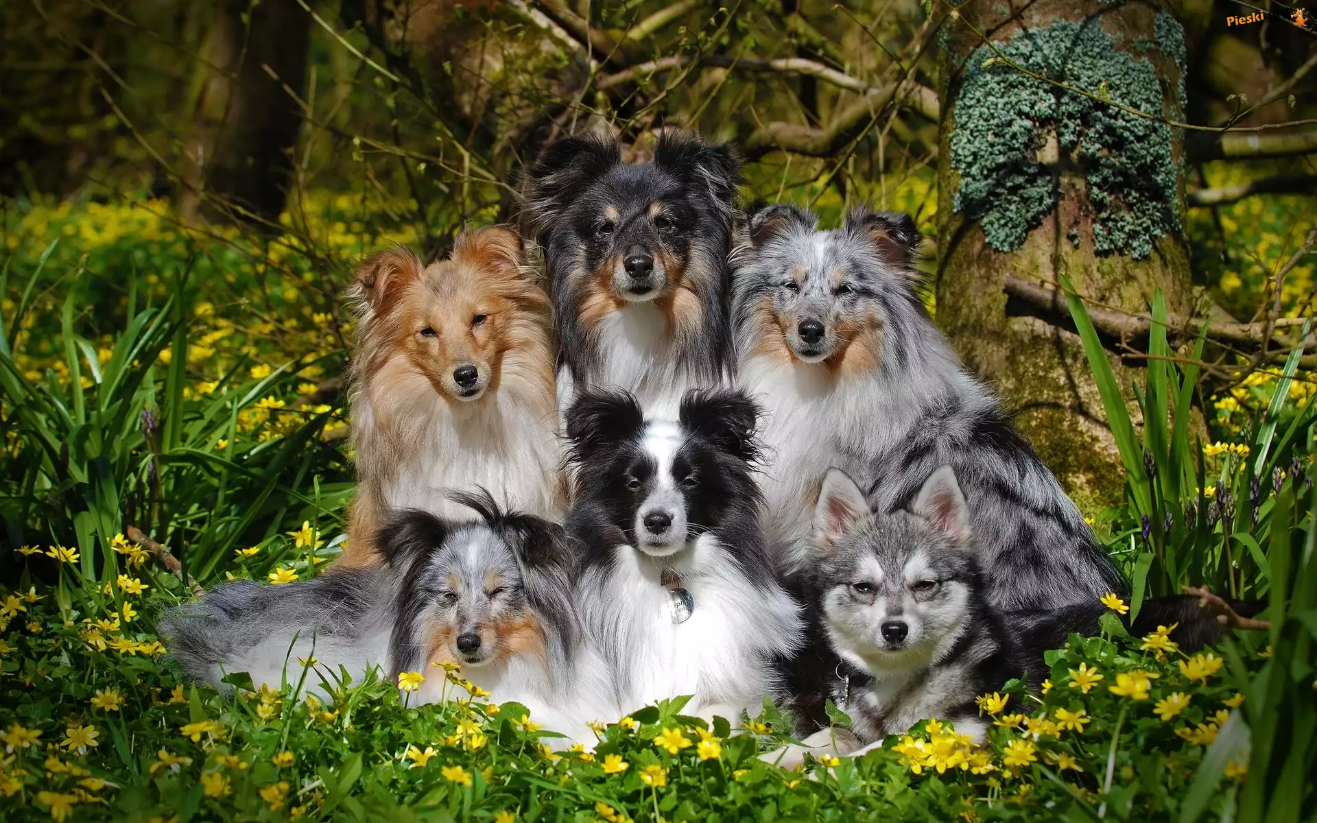 Owczarki szetlandzkie, Psów, Sześć, Kundelek, Kwiaty, Pieski