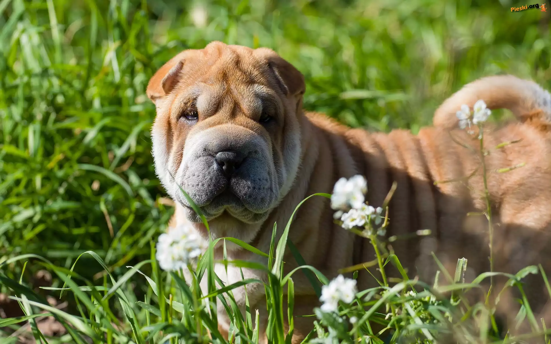Trawa, Shar pei, Pies, Łąka, Kwiaty, Pieski